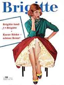 | | Brigitte - "Die Frauenzeitschrift neuen Typs" - "Das Titelmädchen ist Jean Seberg" - Themen z.B.: "Versandhäuser - Mein Kleid kommt mit der Post", "Wenn Männer von der schlanken Linie träumen...", "Vorsicht! Zugbekanntschaften!" |